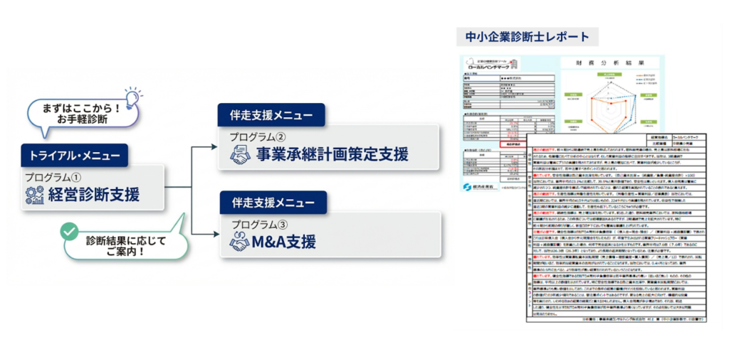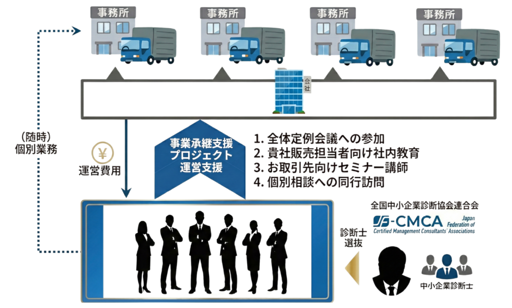 - 商圏分析、営業担当者の教育研修、アプリなど営業ツールの開発、事業承継計画の策定、承継手続きの実行支援